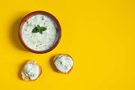 A bowl and crostini or bruschetta with traditional greek tzatziki sauce isolated on the yellow background