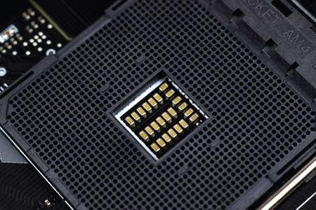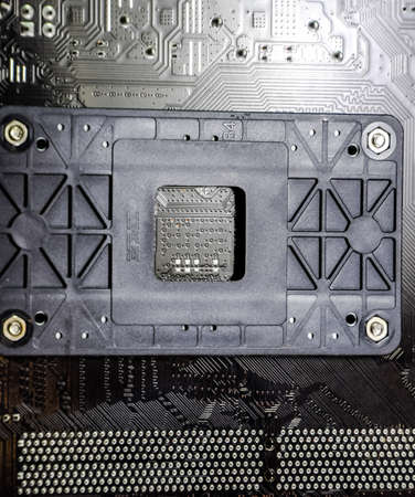 Closeup detail of CPU socket of a modern computer black motherboard. Electronic small component details. Select focus