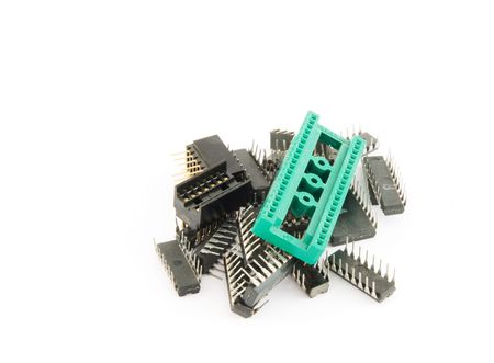 Stack of IC sockets on white background.