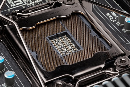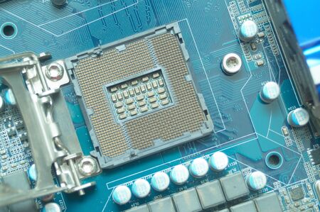 Detail of cpu socket on a modern computer motherboard. Electronic small component details.