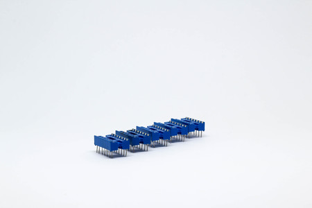 Row of five blue IC socket on white background.
