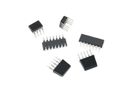Microchips in a DIP case on a white background. A microelectronic element. Black microchips.