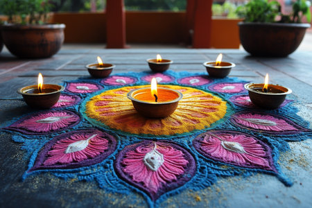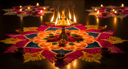A colorful rangoli pattern is created on the ground with meticulous designs, illuminated by traditional oil lamps around it.