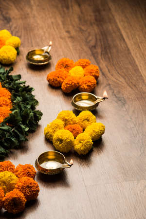 Indian Festival Diwali , lamp and marigold flower petals in pooja thali