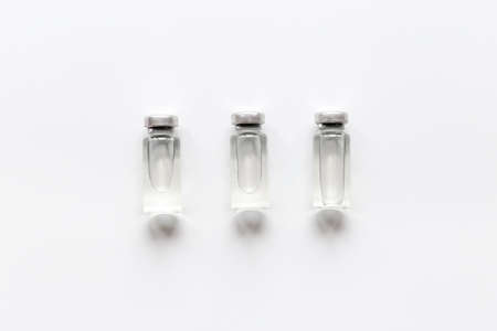 three Covid-19 vaccine vials with white background to inject medical professionals and people at risk .. SARS-CoV-2 vaccination treatment. Copy space.