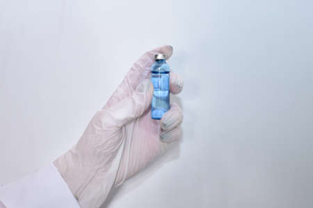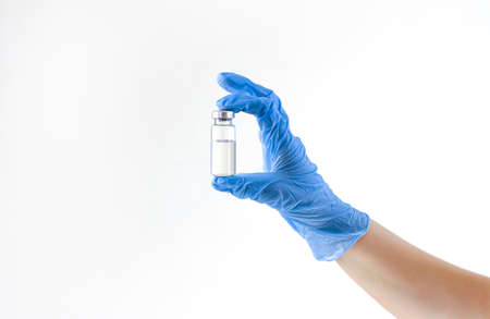 A hand in a medical glove holds an ampoule with a vaccine against the coronavirus infection COVID-19 on a white background. Vaccine. Ampoule with medicine. Doctor holds an injection drug in his hand.