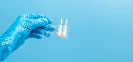 Medical glove. Ampoules with a white liquid in the hand in a blue medical glove. Isolated on a blue background.