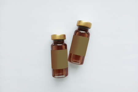 The vaccine comes in a brown glass jar with a brown label. white background.