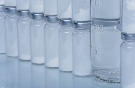 Antibiotic. A row of glass medical vaccine bottles