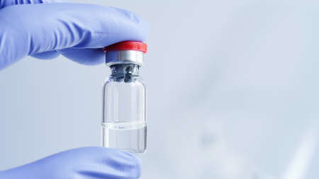 vaccine bottle held by hand with glove . High quality photo