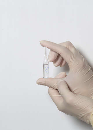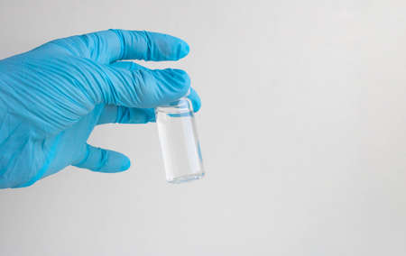 The doctor holds an ampoule with a vaccine. Hand in medical glove with the glass ampoule. Concept of danger or the need for vaccination.