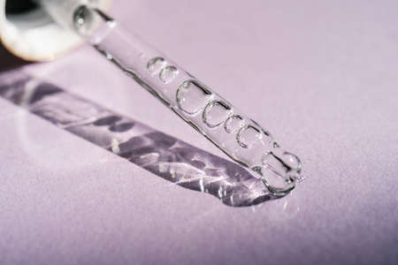 Pipette with white serum close-up on a purple background in soft focus. The appearance of the cosmetic liquid texture in drops. Skin care products. Beauty concept for face and body care