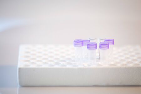 Close up woman hand in a rubber gloves put sample in a glass vial with blue cap into the autosampler rack in HPLC system. High performance liquid chromatography for separation compounds . Scientific and research work at chemical or clinical laboratory