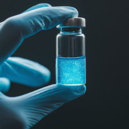 A hand of a nurse wearing a blue glove, picking up a vial of coronavirus vaccine, with a black background
