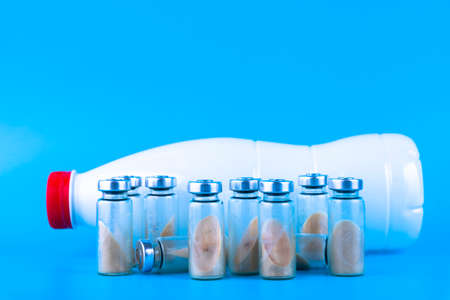 Vials, ampoules with dry probiotic, bifidobacteria and a bottle with milk on a blue background. Copy space.