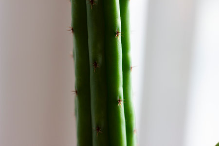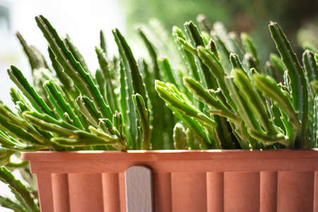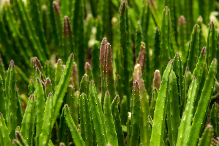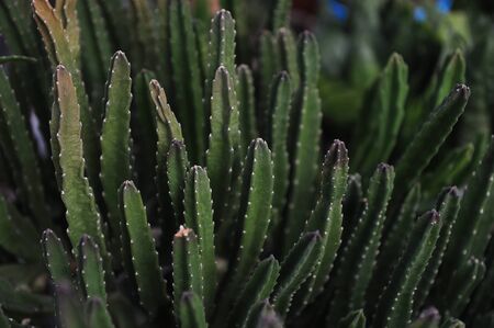 Texture green prickly cacti close-up, beautiful background. Densely growing cacti in Sunny weather grow on the African continent. Very sharp spikes that are invisible. Home decor,