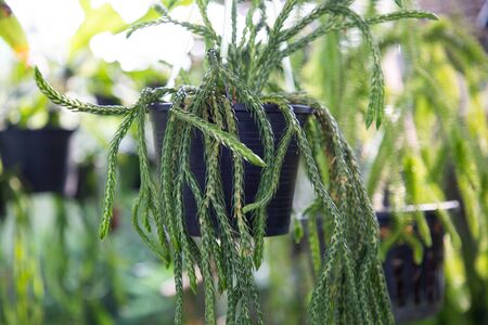 Rat Tail potted Cactus outdoors on the blur background of bright green foliage. Scientific Name: Disocactus flagelliformis (Latin), Family: Cactaceae