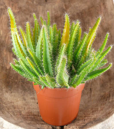 The cactus in a brown clay pot is named Cereus tetragonus.