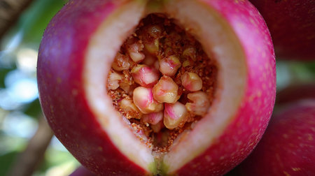 A rose apple is cut open to reveal tiny rose buds growing inside. This unusual sight captures nature