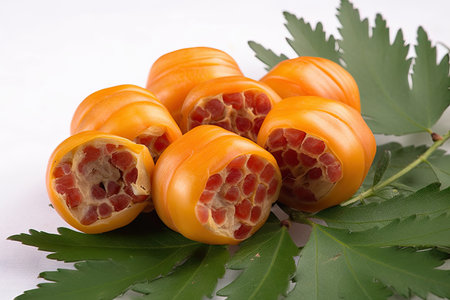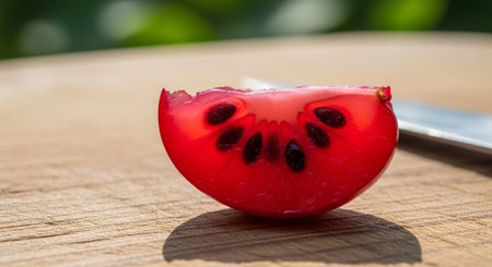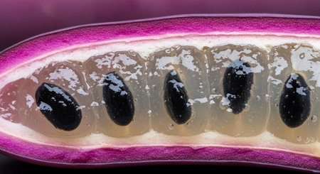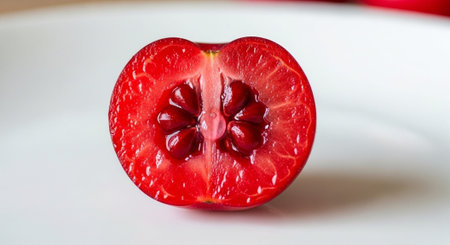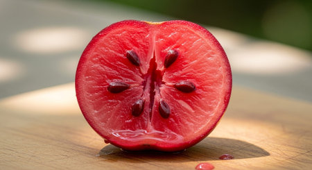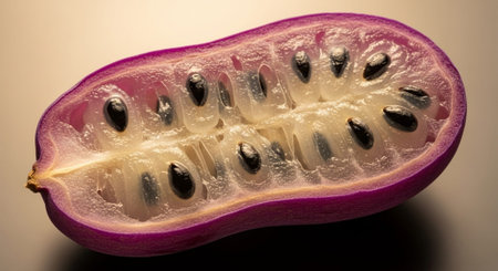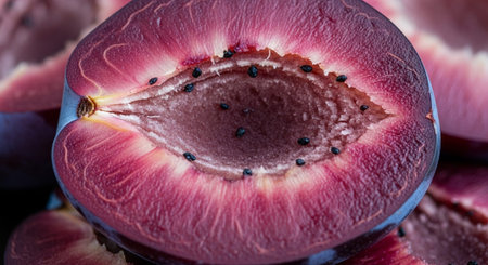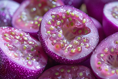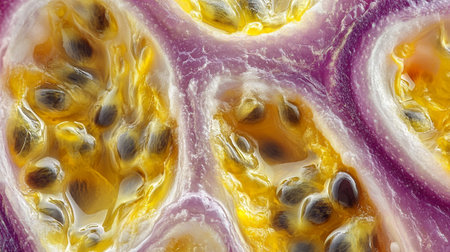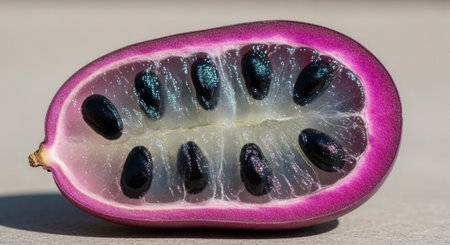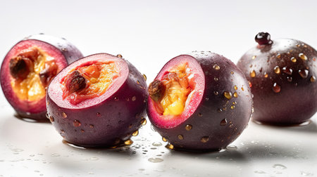 AI Generated. passion fruit halves - vibrant red pulp and seeds