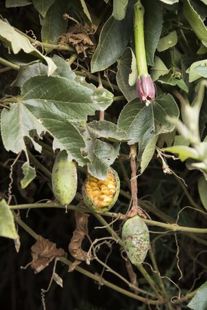 Banana passionfruit also known as curuba, passiflora mixta, plant with hanging fruits, including an open one, and a flower bud