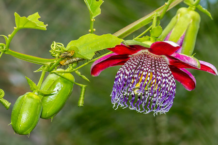 A Beautiful Passiflora alata in full flower with some Caterpillars on the leaves.