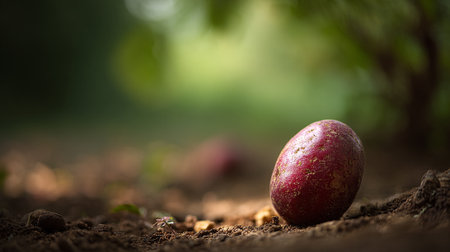 Red potato resting on dark soil against a soft green blurred backdrop