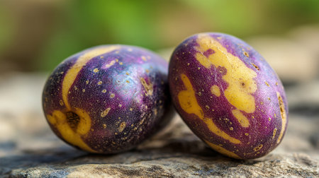 Two striking pepino dulce fruits displayed with natural sunlight and blurred background.