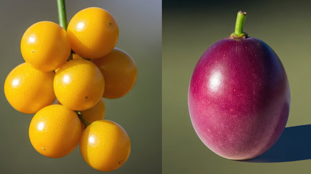 Passion fruit on a green background. Ripe yellow and purple passion fruit.