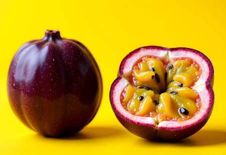 Passion fruit halves show yellow pulp, alongside a whole fruit on a vibrant yellow background