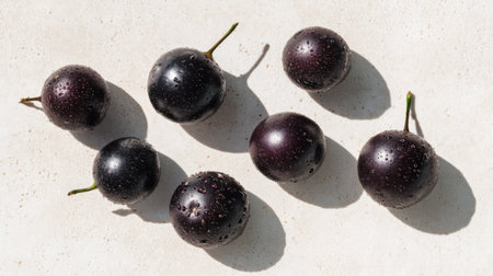 Delight in the beauty of fresh black plums adorned with waterdrops on a light surface, emphasizing their vibrant color and natural appeal for culinary inspiration.