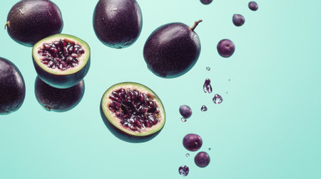 A stunning close-up image of fresh blue and purple fruits set against a light blue background, highlighting the vibrant colors and natural textures perfect for food styling.