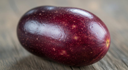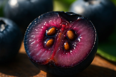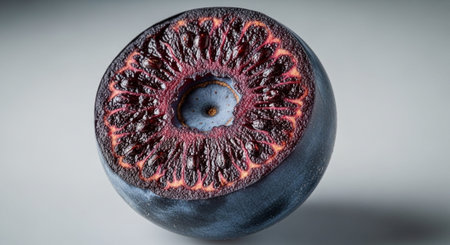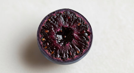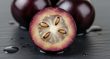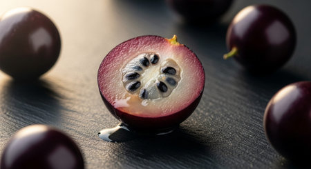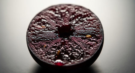 Close-up view of a sliced grape revealing rich color and texture in early morning light