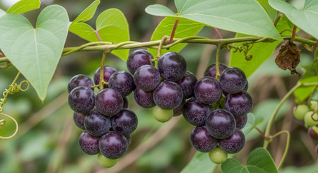 Lustrous Crimson Sphere: A Grape Vine's Delicate Fruit Displayed in Natural Light