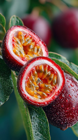 Two vibrant passion fruit halves, glistening with water droplets, are showcased on a lush green vine. Their bright yellow arils are visible, contrasting beautifully with the deep red skin.
