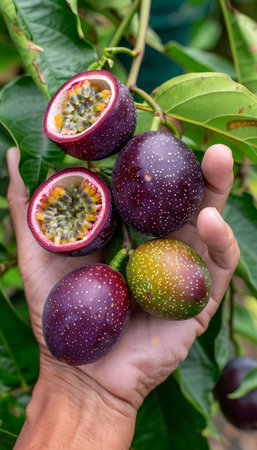 Passion fruit selection hand holding exotic fruit on blurred background with copy space