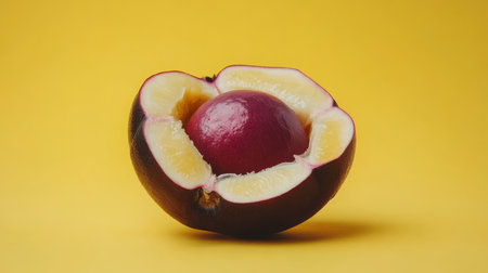 Ripe Mangosteen Fruit, Cut Open, Revealing Juicy White Segments, Isolated on Yellow Background