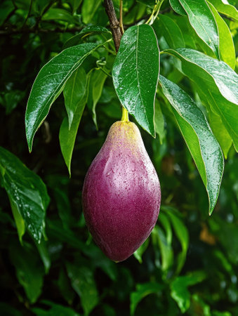 Close-up of a ripe, purple fruit hanging from a tree branch