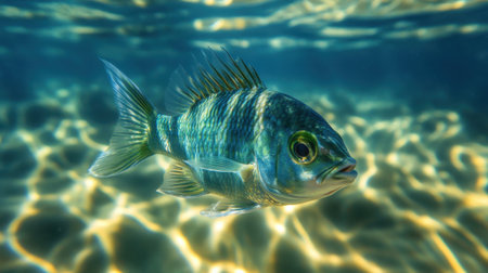 A vibrant fish swims gracefully in a bright underwater scene. Sunlight reflects off the clear water, enhancing the colors and textures of this marine life.