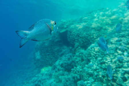 Underwater view with a fish near the reef in the tropical ocean. Tropical fish in coastal waters. Wildlife. Sea and ocean world. Life in a coral reef. Ecosystem.