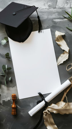 Elegant aesthetic invitation template for graduation, empty white blank, a graduation hat, diploma. Generative AI.