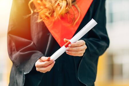 The girl is a graduate, holding a diploma from the University. Concept of the graduation ceremony