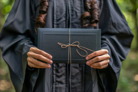A person wearing a graduation gown holds a diploma in their hands, celebrating their academic achievement.