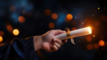 A person holding a diploma tied with a golden ribbon, captured against a backdrop of softened lights, symbolizing educational achievement and personal growth.