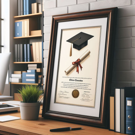 A framed graduation diploma with a cap illustration is displayed on an office desk, symbolizing academic success. The modern office setup includes books, a potted plant, and a bright, inviting atmosphere.. AI Generation
