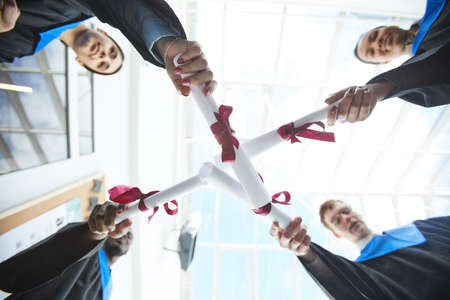 Low angle view at cheerful university graduates holding diplomas while standing in circle indoors, copy space