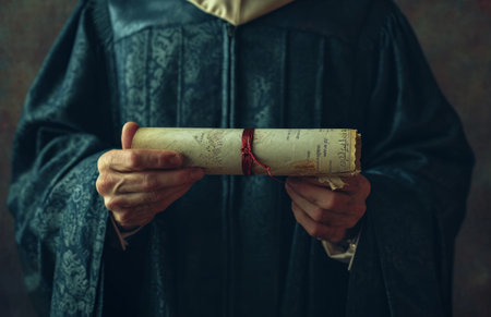 A hand elegantly holds a scroll adorned with a golden ribbon, set against a dreamy bokeh of warm lights, symbolizing achievement, education, and moments of celebration.
