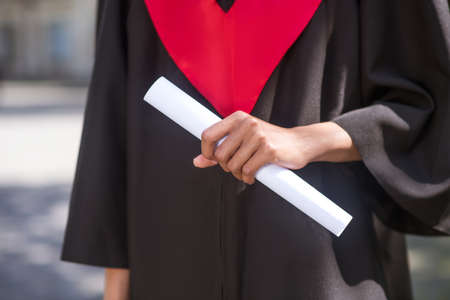 Cropped image of successful graduates in academic dresses holding diplomas while standing outdoors