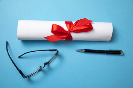 A beautifully designed rolled diploma tied with a vibrant red ribbon, set against a calming blue background. Ideal for conveying achievement and celebration themes.