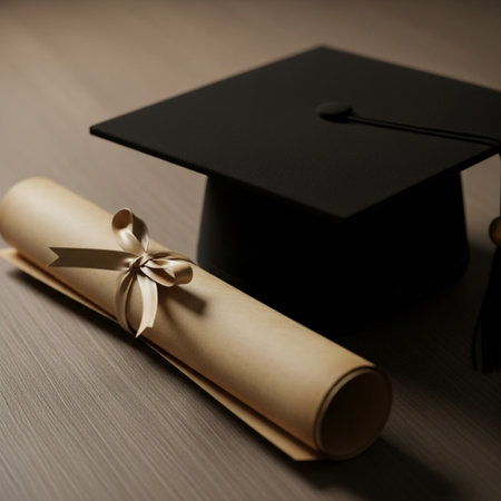 A close-up of a rolled diploma tied with a ribbon, placed beside a black graduation cap, set against a background of soft light and celebration